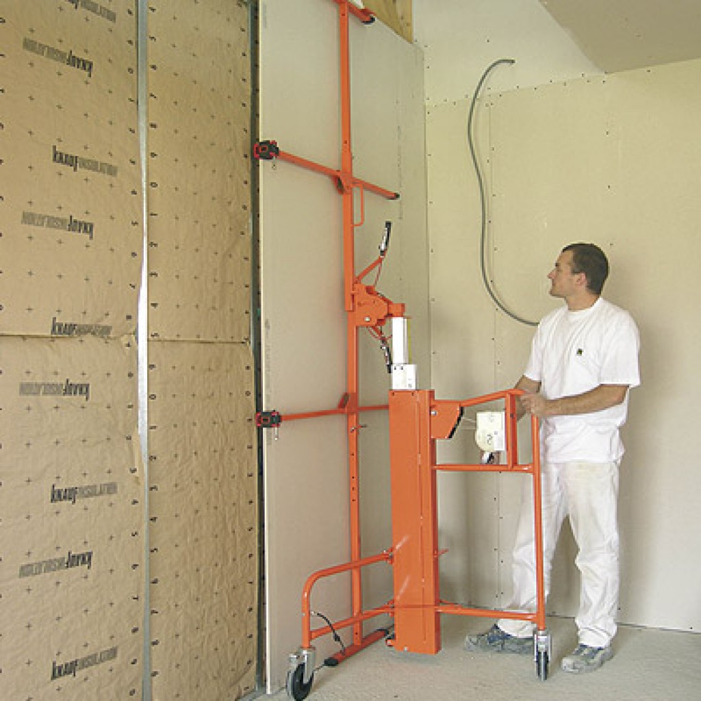 Подъемник для ГКЛ (гипсокартонных листов) даёт существенные преимущества во время выполнения операций с гипсокартонными листами в сравнении с осуществлением всех работ вручную:
