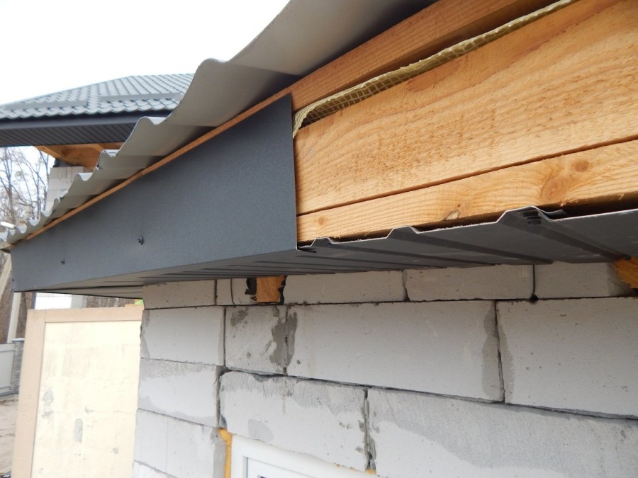 Этот материал прост в монтаже – ведь его можно класть большими плоскостями, а крепить с таким же расстоянием, как доску. Высотой его профиль может быть от 0,8 до 2 сантиметров. При подшивке свесов крыши профлистом оставляют зазор от 0,6 до 1,2 сантиметра (зависит от температурного расширения). Вентиляцию делают при помощи специальных решеток.