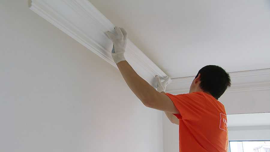 - Затем наносим клей на основание галтели и прикладываем ее к стене. Плотно прижимаем, следя за тем, чтобы излишки клея не попадали на обои.