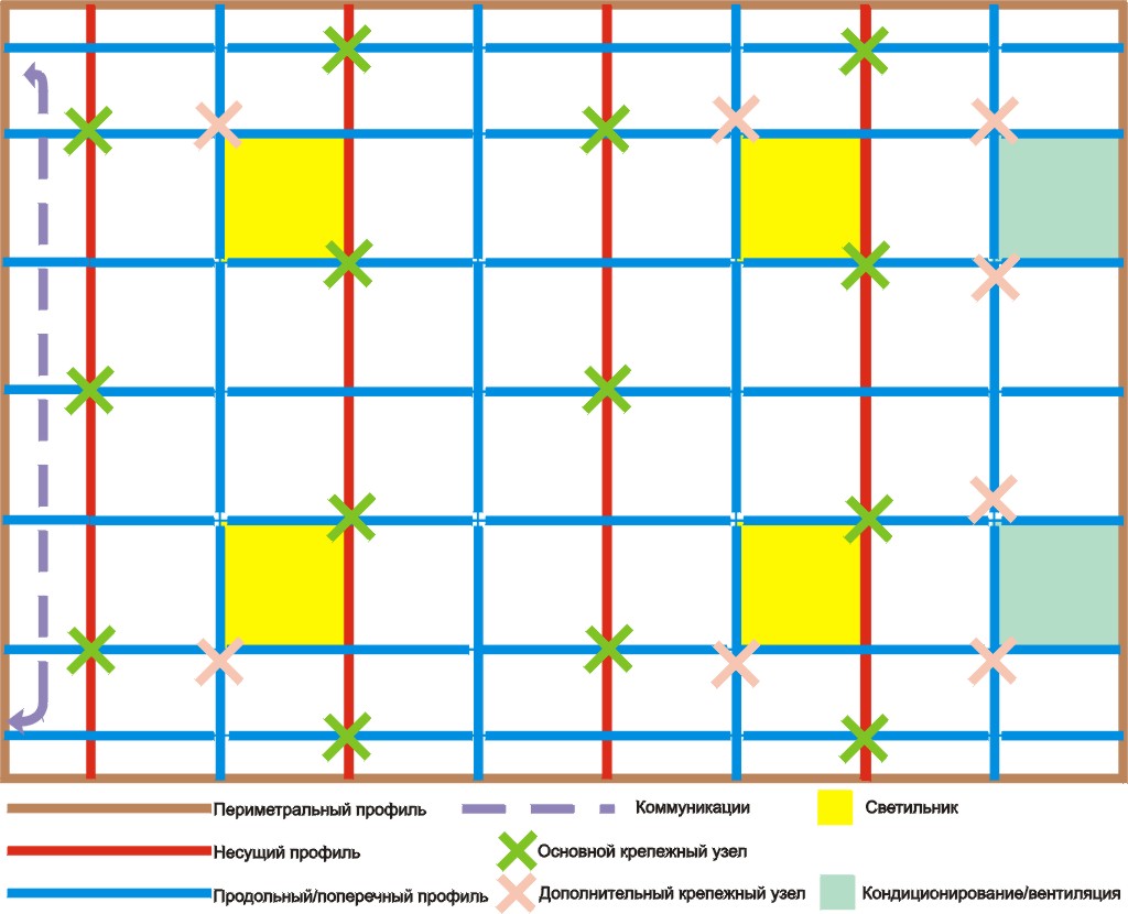 В любом случае полученные значения округляются до ближайших больших целых значений штук профиля стандартной длины или подвеса. Периметр крепится к стенам с шагом 0,6 м в случае мягких плит без дополнительной нагрузки или 0,3 м для жесткого или нагруженного потолка. Точечные светильники и пластиковые вентиляционные решетки дополнительной нагрузкой не считаются.