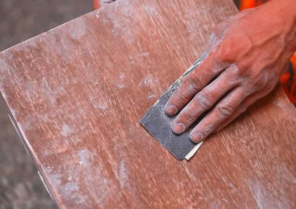 - Если поверхность окрашена, надо удалить слой лака наждачной бумагой (сначала грубой, а затем мелкозернистой).