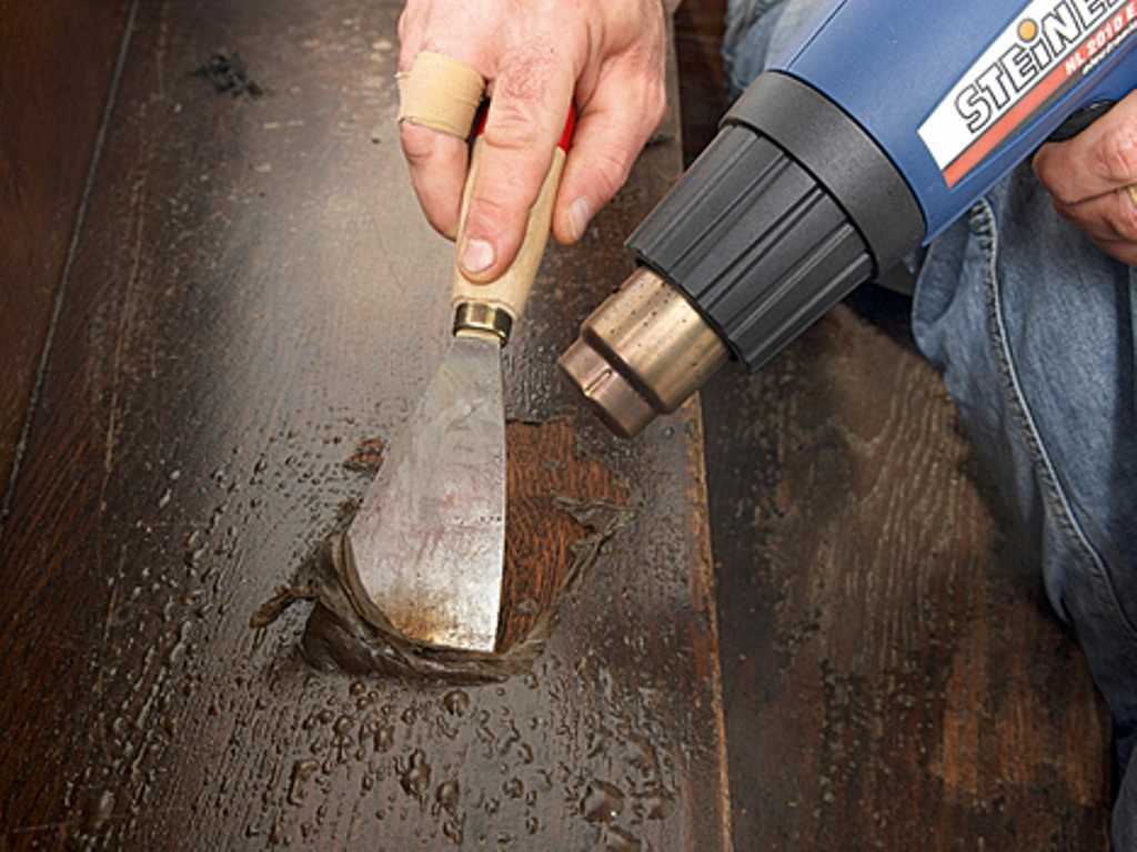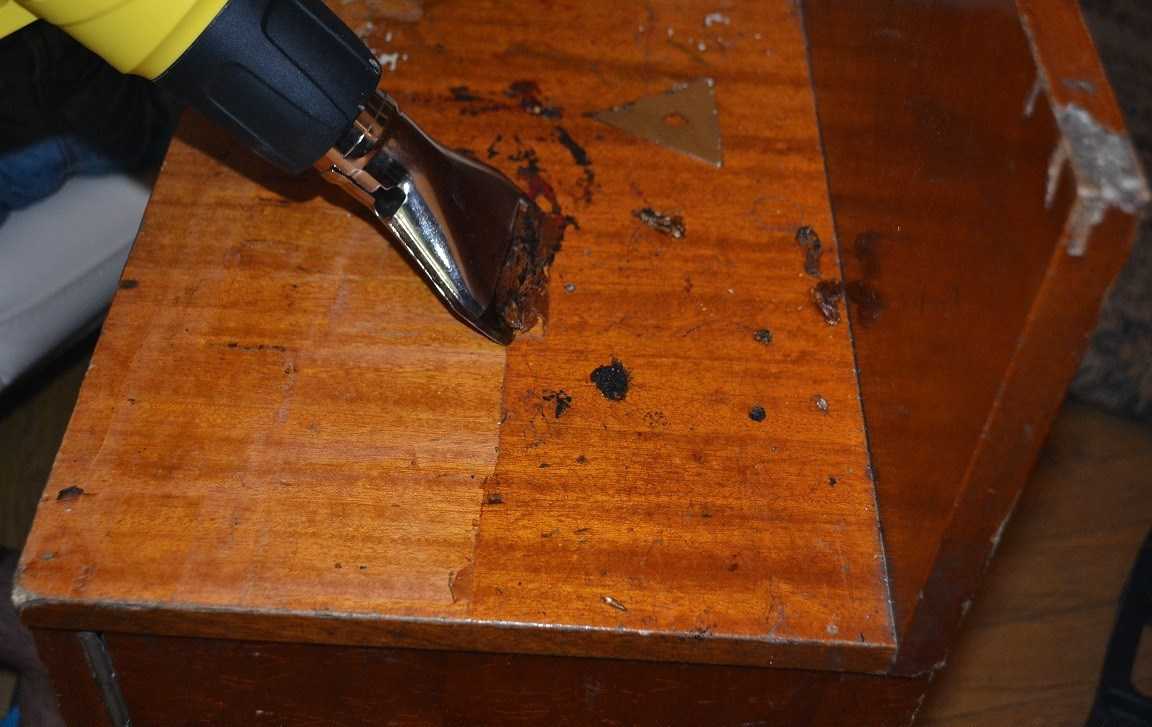 - Термический способ удаляет старое покрытие с помощью строительного фена. Нагревая плоскость одной рукой, второй соскребаем полировку или лак. При этом способе нужно быть аккуратными с температурами, чтобы не произошло воспламенения.