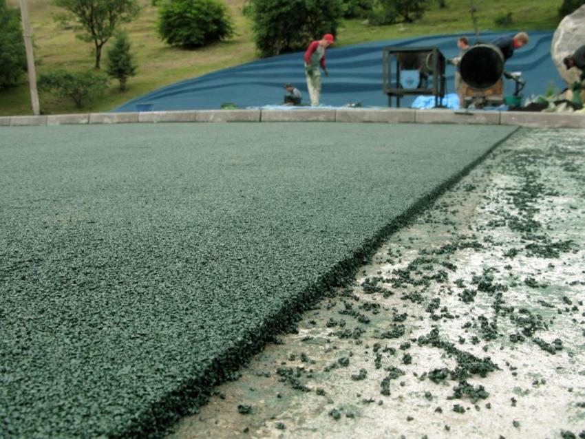 Подобрав нужное процентное соотношение компонентов, следует производить все замесы, используя данную рецептуру, так как только в этом случае удастся добиться однородного по плотности и окраске резинового покрытия на всей поверхности площадки.