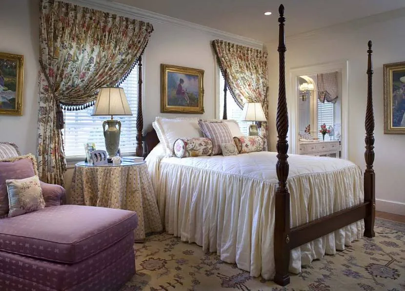 - Романтический – стиль, нежный тон розового, молочного, голубого и персикового. Придадут комнате и влюбленным романтики. А рюши и складки сделают комнату по-настоящему королевской.