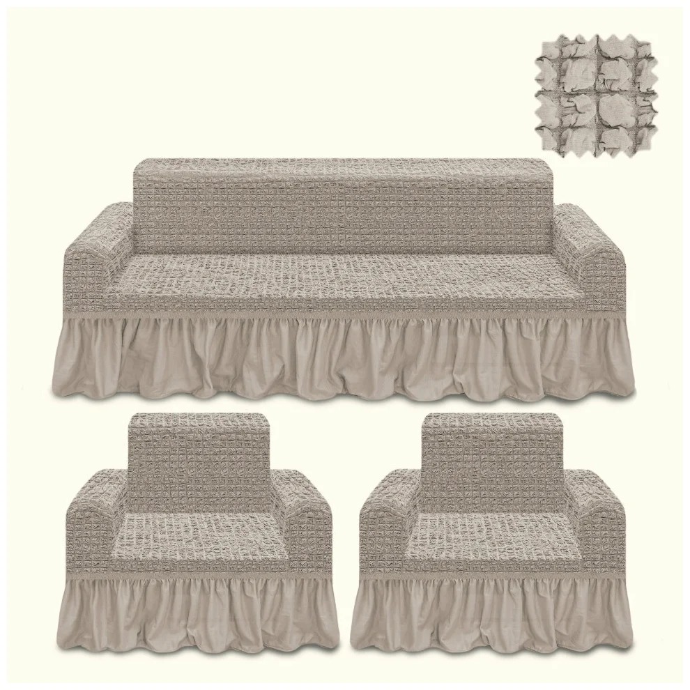Комплект для небольшой софы и 2 кресел из серии Larry успешно сочетает в себе простую полусинтетическую ткань и большие оборки, что сделает вашу гостиную уютнее. А благодаря тому, что материал хорошо тянется, комплект может подойти к любому кресло или трехместному дивану.