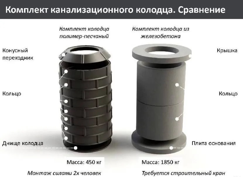 Полимерно-песчаный колодец представляет собой сборную конструкцию из колец, конусного переходника, днища, люка. В сравнении с железобетонными кольца из полимерно-песчаного материала легче практически в 10 раз, поэтому их погрузку-выгрузку, а также монтаж можно выполнять вручную.Он более удобен в монтаже, поскольку для его установки не требуется применение специальной техники. Соответственно, стоимость обустройства канализационной системы с использованием колодца из композитного материала обходится дешевле