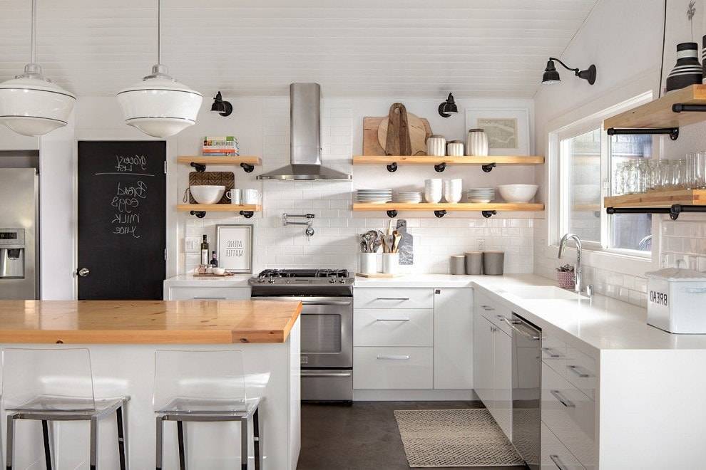 Полки — это отличный вариант для эргономии пространства на кухне