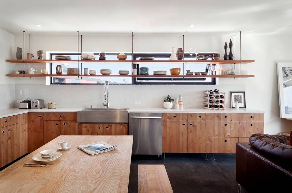 На кухне бывает сложно обойтись без навесных конструкций. Если помещение узкое, монтаж навесного шкафа значительно сократит и без того небольшое пространство. Настенная длинная полка небольшой ширины станет хорошей альтернативой. Отличаясь высокой функциональностью, она не сделает комнату чрезмерно загруженной. Вместо одной длинной полки можно закрепить несколько штук, расположив их друг над другом.