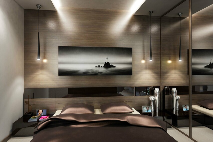 Следует правильно рассчитать освещение и подобрать осветительные приборы. Например, светодиодные ленты, спрятанные в ниши и освещающие потолок, создают глубокий, пространственный эффект.