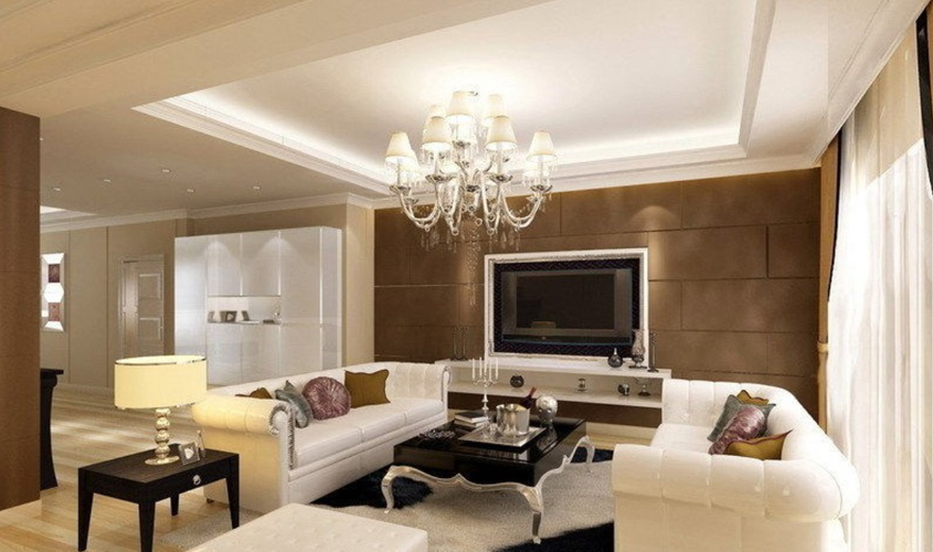 В просторном помещении зала выгодно использовать цветовой акцент, при котором основа потолка совпадает с оттенком обшивки кресла или дивана. Для создания эффекта имитации фигуры из двух ярусов на одноуровневом потолке используется гипсовая лепнина. Она разнообразит бесконечным количеством вариантов исполнения – от завитков в стиле Классик, до форм в стиле Ампир и Модерн.