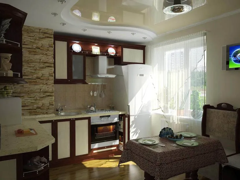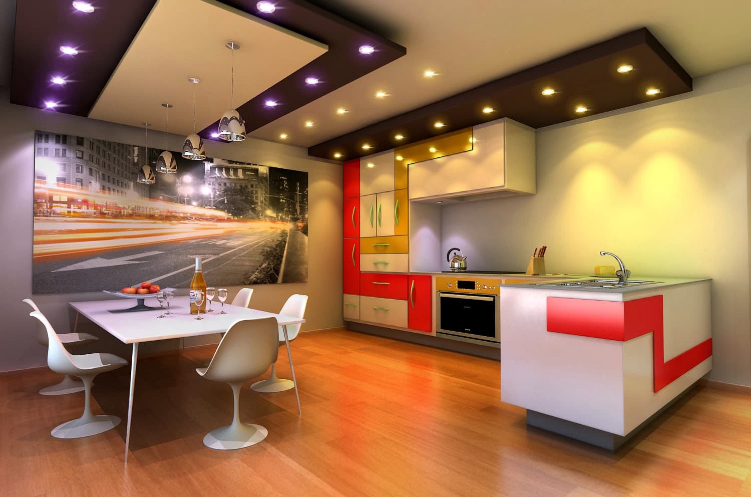 В дизайне потолка на кухне чаще всего применяют правильные геометрические фигуры. Круглая планировка хороша для того, чтобы выделить центр комнаты, а прямоугольные потолки прекрасно скорректируют форму помещения. К примеру, для рекомендуется квадратная форма, которая зрительно расширяет стены. Для кухни можно подбирать и волнообразные фигуры необычных и причудливых конфигураций, начиная с обычных овалов и заканчивая невообразимыми зигзагами.