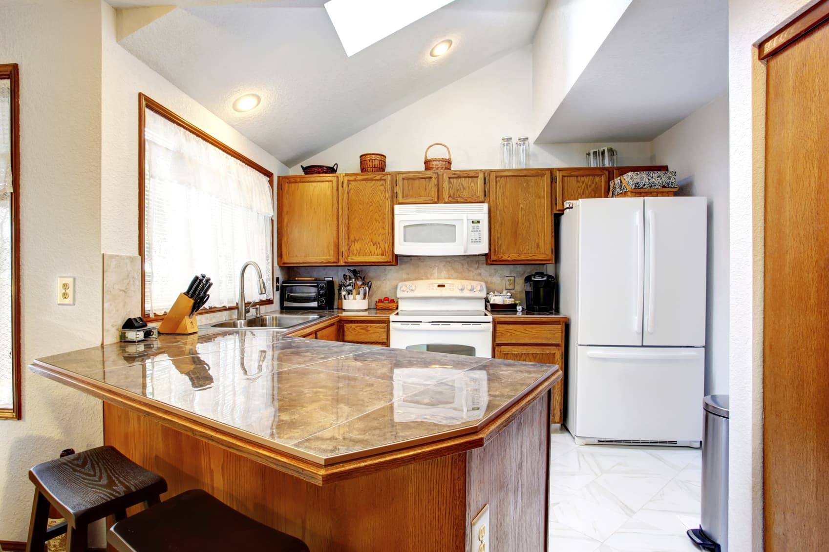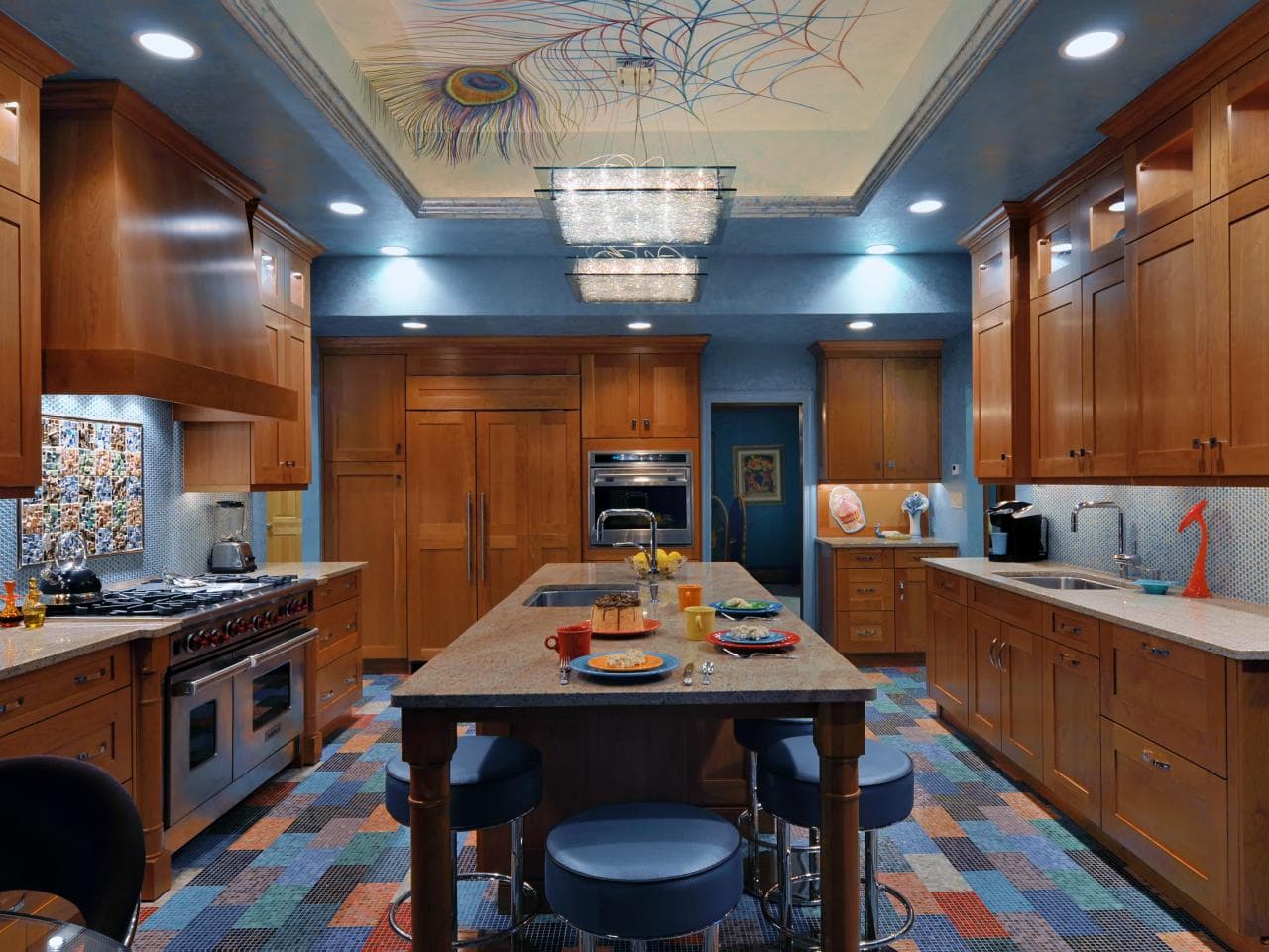 Делите на зоны не только потолок, но и стены, пол. Играйте с дизайном, дублируйте различные элементы, подчеркивая общий стиль! Такое оформление сделает вашу кухню необычной, модной и будет гораздо интереснее смотреться, чем стандартная окраска потолка в белый цвет.