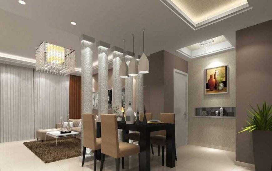Как мы уже упоминали, важно предусмотреть функциональное деление на зоны: рабочая (кухня) и место отдыха (столовая-гостиная). Границы между комнатами можно создать с помощью необычной архитектуры потолка, выстраивая различные геометрические фигуры или разграничительные линии