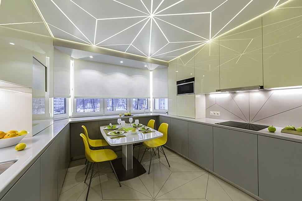 Используя вращающиеся точечные светильники можно обыграть пространство так, чтобы была эффектно выполнена подсветка кухонного гарнитура, выделив в нем самые интересные моменты.