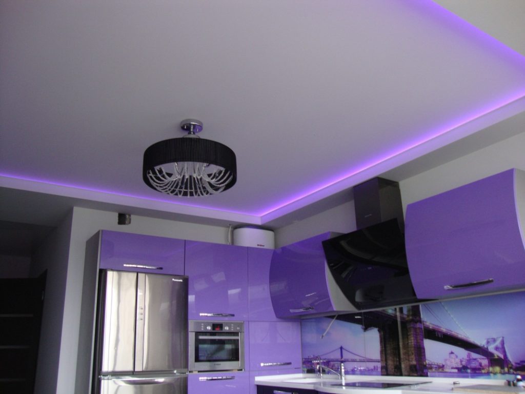 Сложнее все обстоит с кухнями. Желательно использовать холодные цвета подсветки. Лиловое, синеватое свечение на психологическом уровне снижает аппетит и выгодно оттеняет цвета фруктов и овощей.