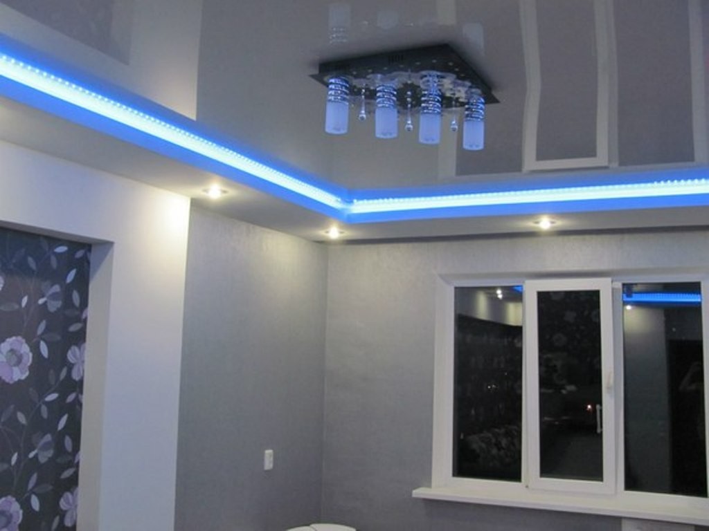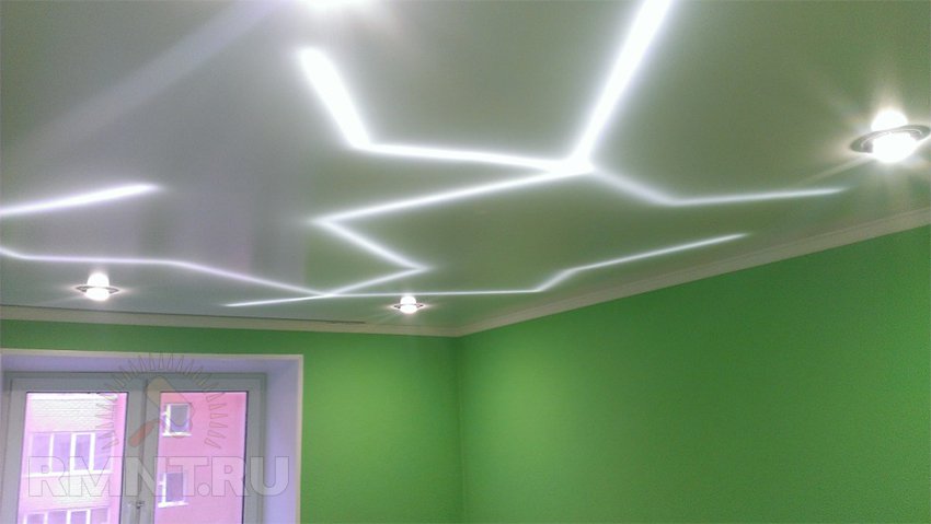 - Над полотном, в любой точке конструкции. Такой монтаж осуществляется в тех случаях, когда натянуто светопропускающее покрытие и до того момента, пока подсветка не будет включена, ее совершенно не видно.