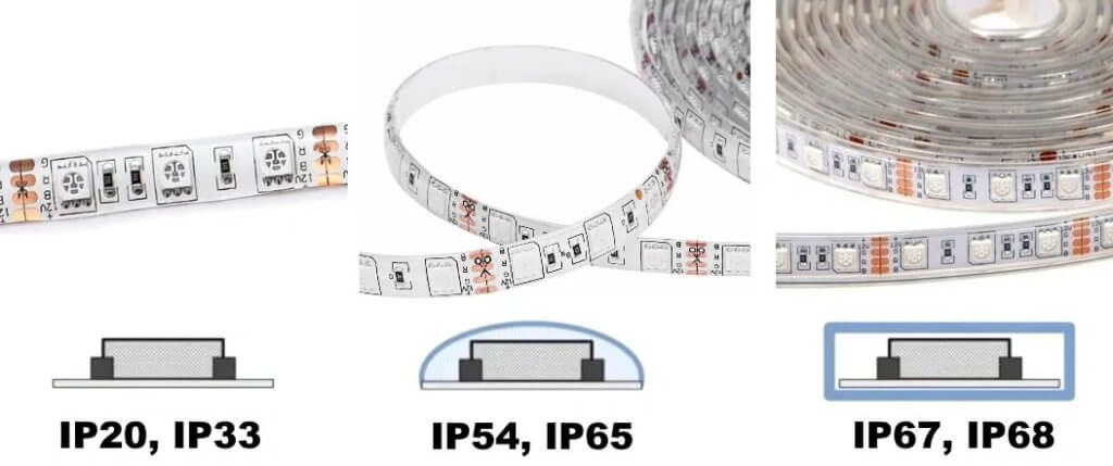 Светодиодные ленты отличаются классом защиты. Этот параметр имеет отношение к влагостойкости лампочек, а также к стойкости относительно влияния пыли и других внешних факторов. Обычно класс защиты конкретного прибора можно прочитать на упаковке товара, он обозначается двумя буквами IP.