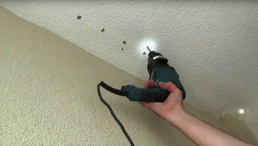 - На потолке размечаются места, где будут фиксироваться крепежные элементы и перфоратором высверливаются отверстия. Бруски крепятся дюбелями, затем закручиваются саморезы с кольцом.