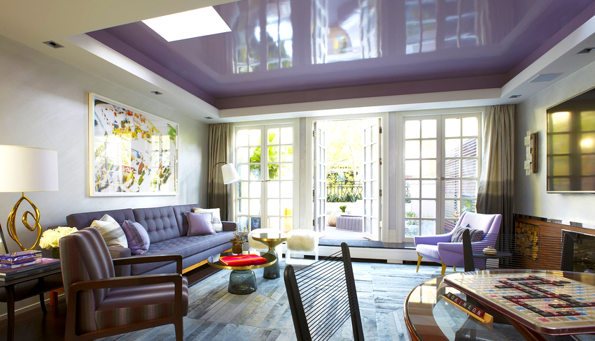 Каждому стилевому направлению характерны определенные цвета и оттенки. Белый органично дополнит классический интерьер, уместен в стилях этно и бохо-шик. Для авангарда и ар-деко неприемлемы бледные тона, матовые поверхности материала. Натяжной потолок в ар-деко может иметь замысловатые формы, золоченое обрамление.