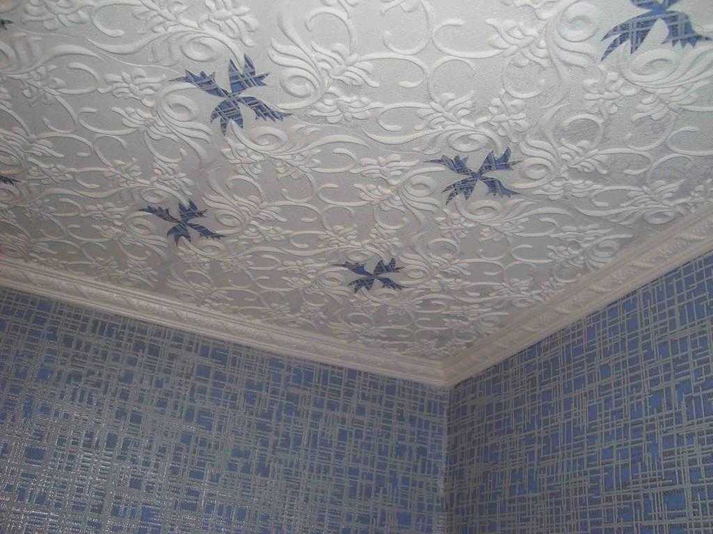Технология оклейки обоев на потолке не слишком отличается от технологии оклеивания стен. Сначала идет грунтовка потолка клеем, ожидание полного высыхания. Нанесение клея на обои. Затем нужно аккуратно прижать руками к потолку, и лишь потом валиком или шпателем удалить пузыри, проводя от центра к краям. Стыки потолка со стеной можно украсить недорогими молдингами подходящего цвета.