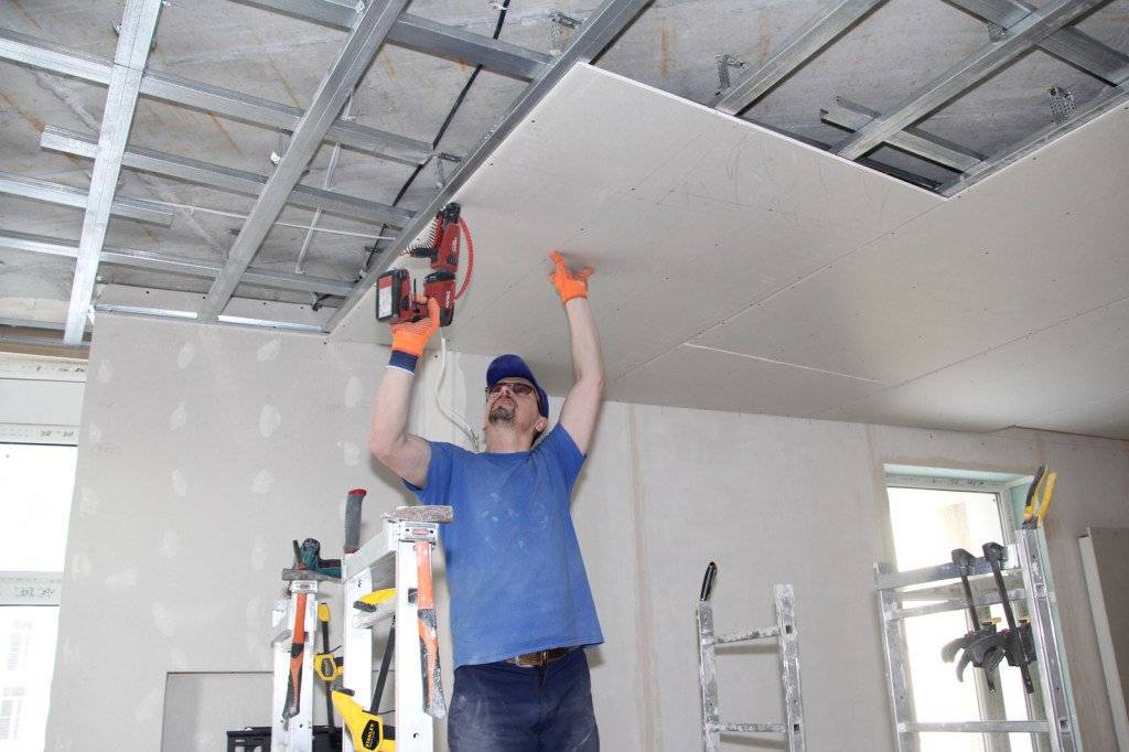 Хорошо работает потолок из гипсокартона. С помощью этого простого материала можно создавать многоуровневые конструкции самой различной конфигурации. Правда, в одиночку это сделать практически нереально — потребуются помощники.