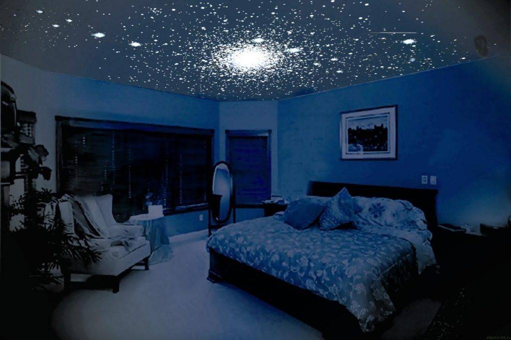 Особую романтическую атмосферу создаст дизайн имитирующий звездное небо или галактику. Такой вариант уместен в спальнях, домашних кинотеатрах и гостиных.