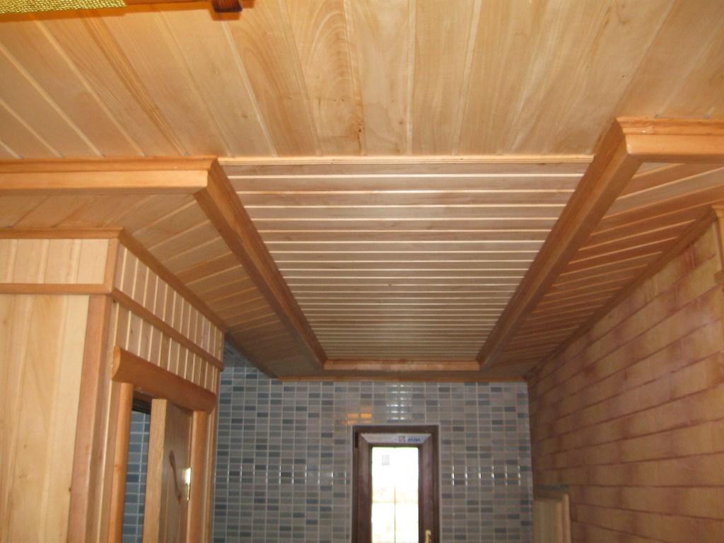 Облицовка. Обшить потолок в парилке можно только деревянной вагонкой. Доску используют из древесины, слабо пропускающую тепло: липа, осина или ольха. В других комнатах бани подойдет вагонка из сосны. Можно обшить пластиком, что особенно хорошо для душевой комнаты