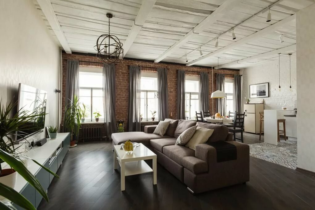 Высокие потолки позволяют использовать индустриальные элементы (фермы, балки, обшивку из дерева, вентиляционные трубы). В квартире с низкими потолками можно использовать штукатурку, которая выкрашивается белой краской.