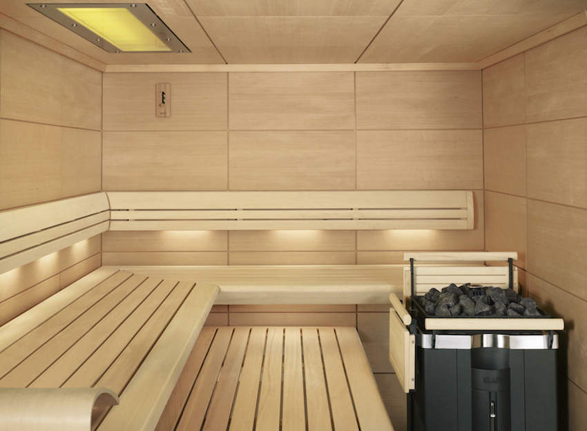 Современная внутренняя отделка комнаты отдыха в бане: фасадные панели по периметру комнаты.