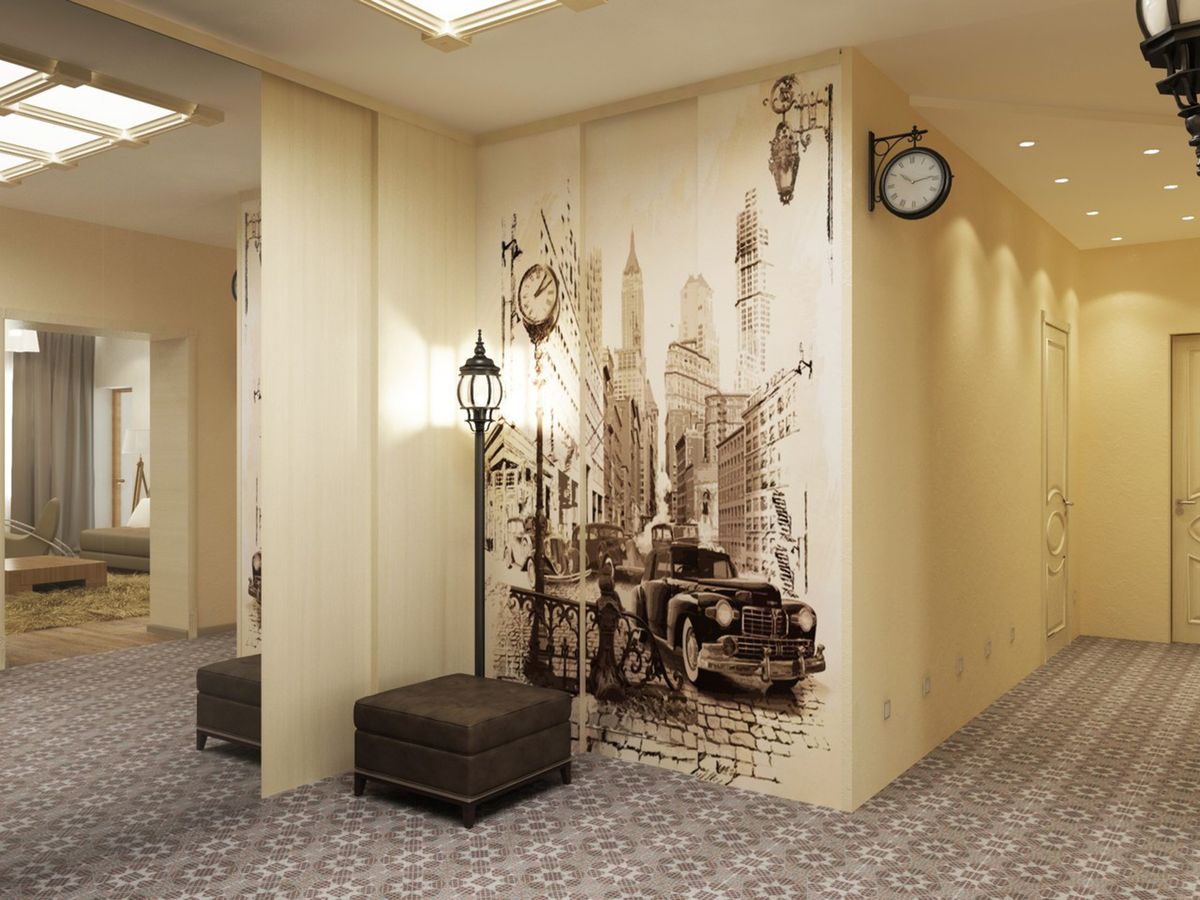 Визуально увеличить масштабы маленькой прихожей смогут фотообои с рисунком какой-то перспективы. Отличными материалами для отделки стен также станут плитка (с рисунком под кирпич), обои, декоративная штукатурка или панели пластика. В рисунках лучше избегать крупных орнаментов и узоров – деликатные элементы или вовсе однотонные покрытия вытянут комнату.