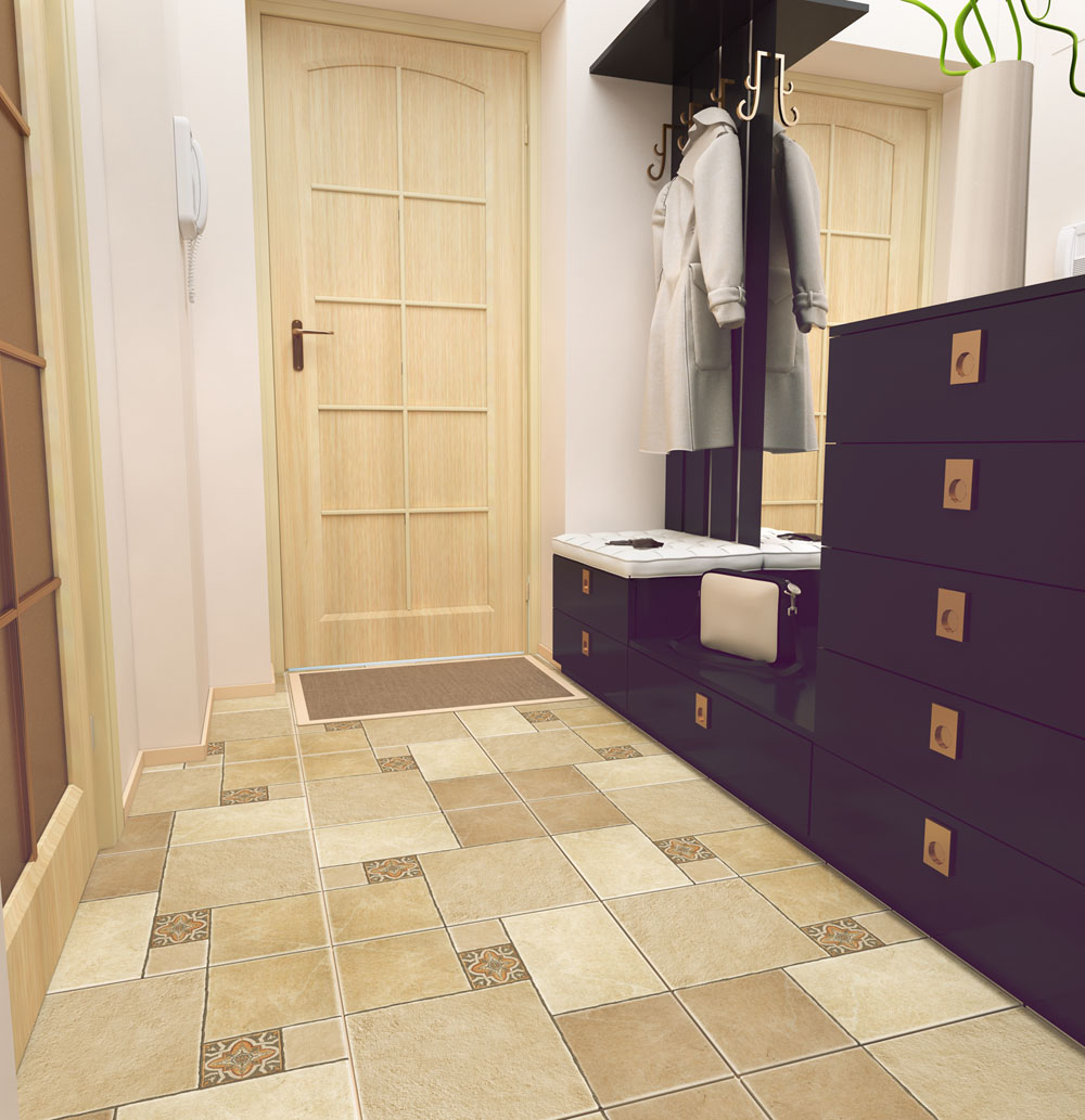 Для дизайна пола в прихожей, да и с практической точки зрения идеально подойдет керамическая плитка или искусственный камень, ламинат и самый бюджетный линолеум. Главное требование к ним, чтобы были прочными, влагонепроницаемыми.