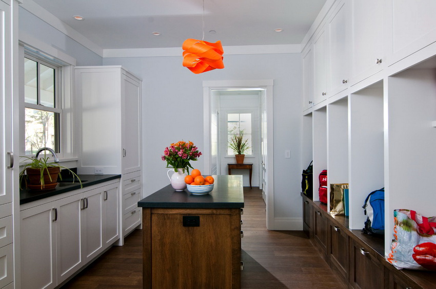 Функциональным решением будет установка шкафов для верхней одежды, полочек для обуви и головных уборов, вешалок. Комбинирование разных видов освещения и отделочных материалов поможет сделать зонирование помещения.