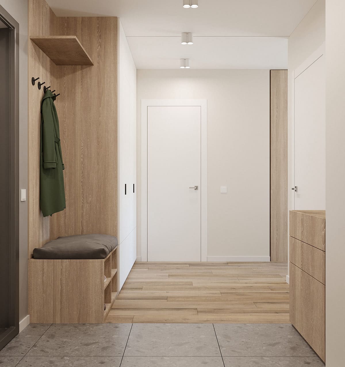 Модный интерьер узкой прихожей 2022 будет смотреться более эффектно, если сочетать разные цвета и фактуры напольного покрытия. Если уровень пола в зоне входа будет чуть ниже, чем в остальных помещениях, то прихожая будет отделяться от других частей квартиры.