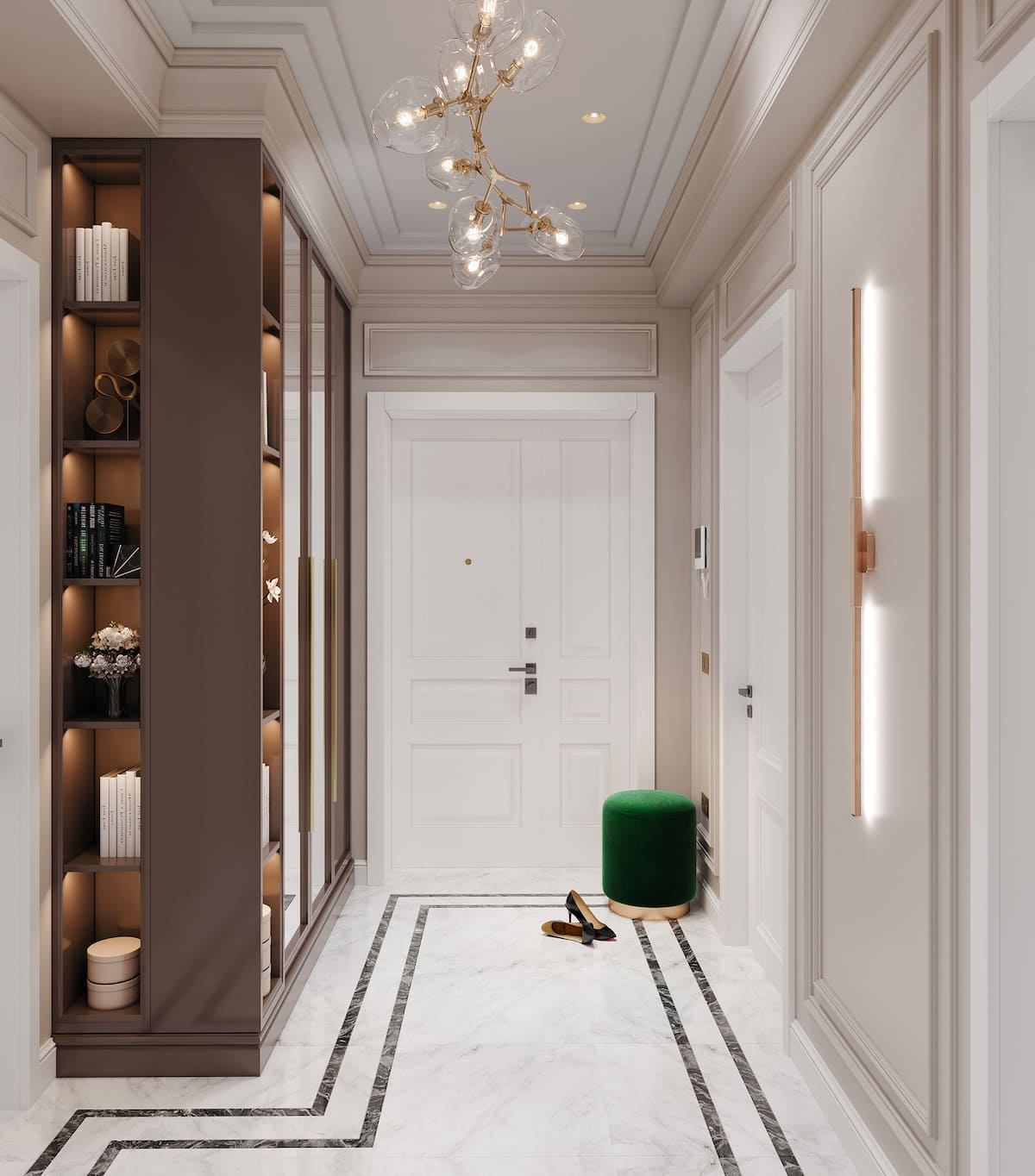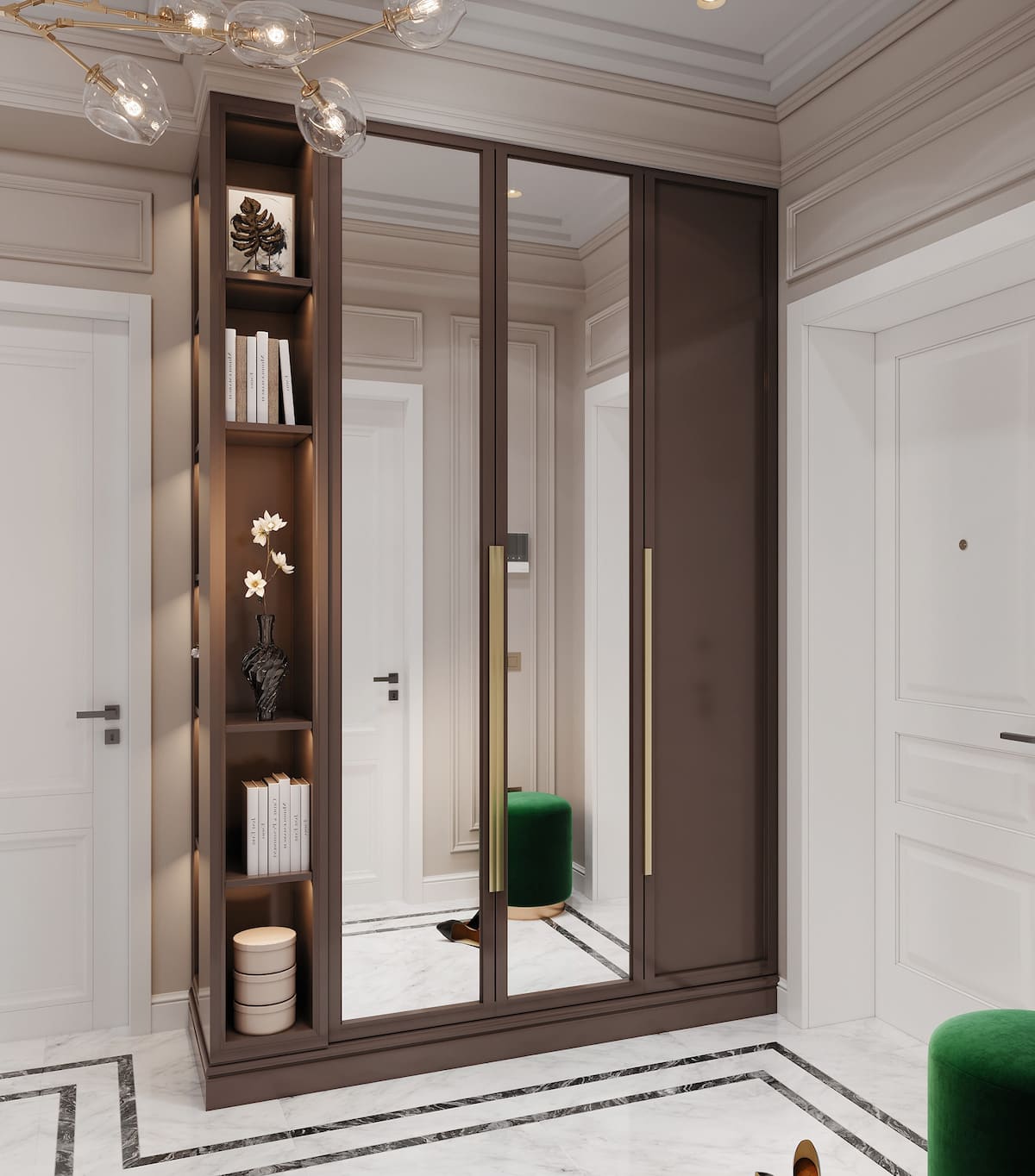 Отличается от традиционной классики продуманностью декора. Прихожая в неоклассическом стиле не лишена аксессуаров, но они должны быть современными.