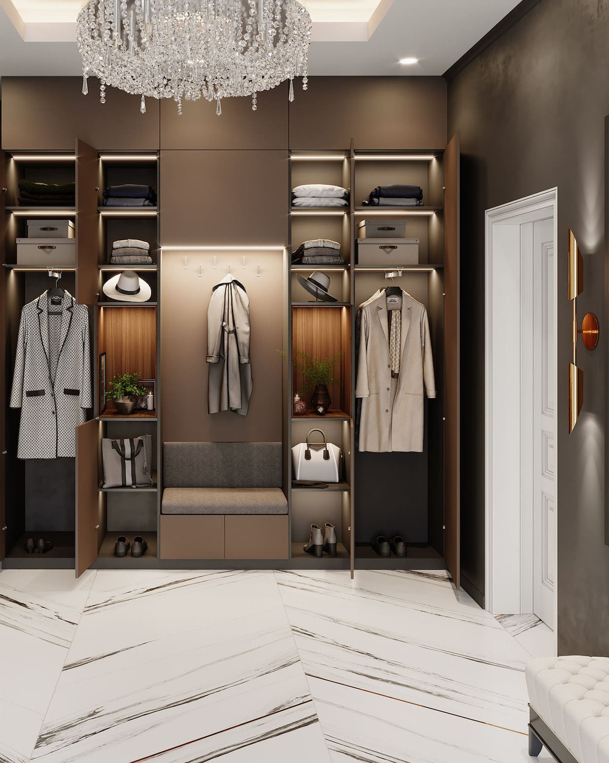 При помощи света можно сконцентрировать внимание на удачных участках коридора или же затемнить некрасивые участки. В шкафу обязательно должно быть своё освещение