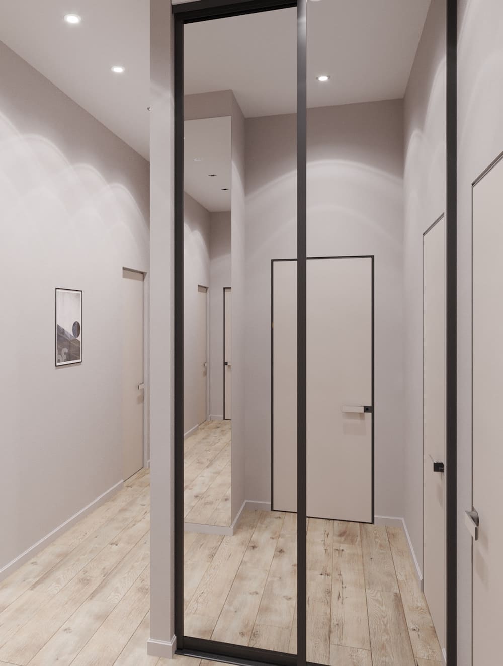 * Шкаф-купе в маленьком коридоре можно вмонтировать в свободный угол или установить его параллельно стене.