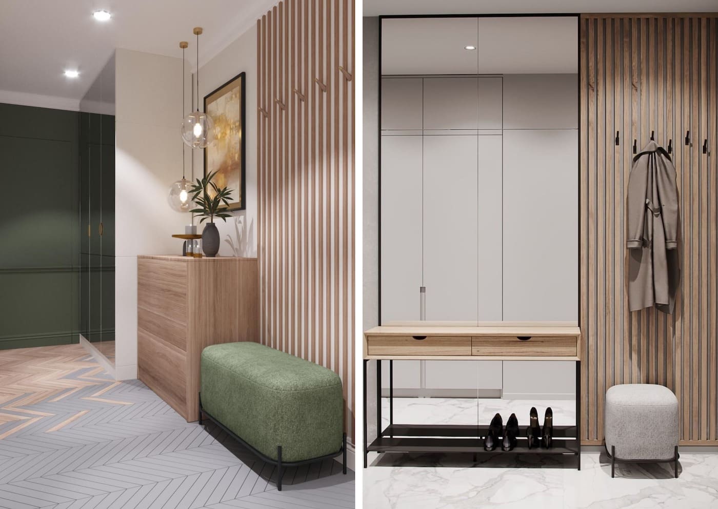 - Рекомендуется размещать вешалку и тумбу для обуви ближе к входным дверям.