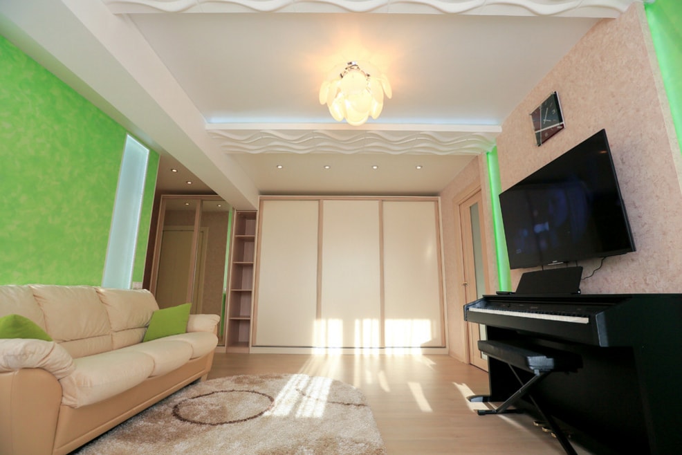 - Разница в поперечных габаритах сглаживается за счет правильной комбинации покрытий на поверхности потолка, стен и пола.