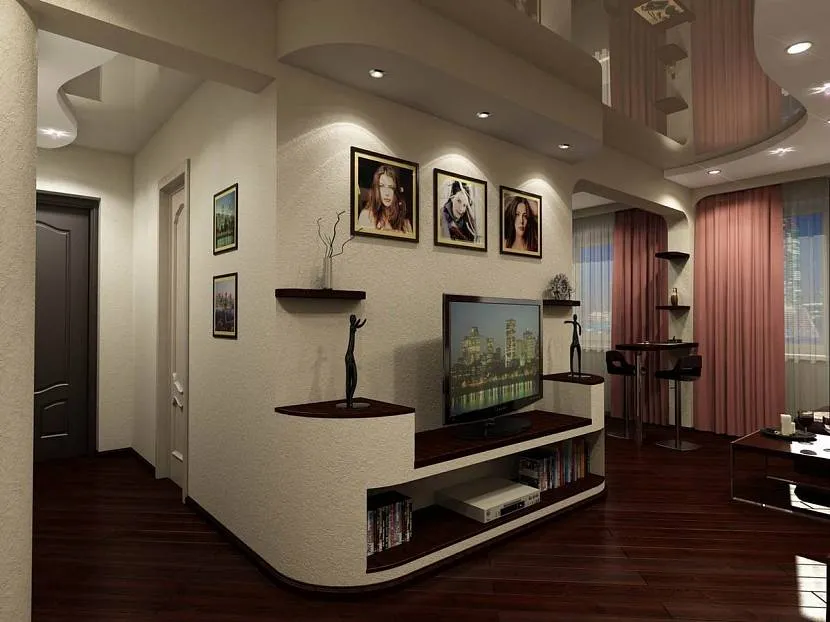 - Обязательно изучите имеющиеся в каталогах или интернете фото зонирования гостиной, выберите несколько подходящих вариантов;