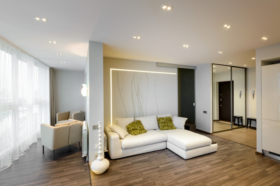 Скандинавский стиль. Его отличают простые линии и детали, лаконичный дизайн, оттенки серого, белого и оливкового. Здесь минимум декора, а вместо мебели находятся модульные конструкции. Нередко они бывают встраиваемого типа. Центр зала лучше оставить свободным. Украшением могут служить картины на тему абстракций.
