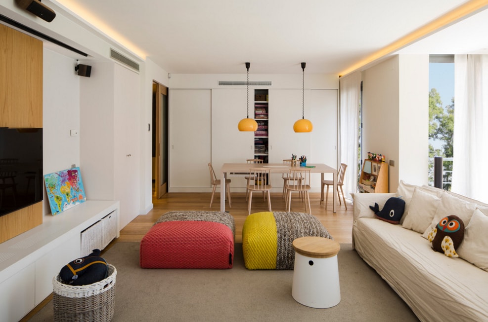 - прекрасный способ зонирования – подиум. Кроме эффектного разграничения он обеспечивает и дополнительные удобства: здесь легко спрятать спальное ложе для ребенка или для родителей, или организовать хранение игрушек;