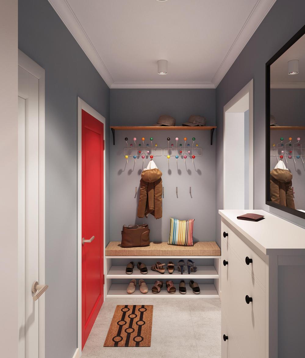 Возле входной двери удобно размещается обувная тумбочка или полка, вешалку для одежды фиксируют, чтобы доставать до нее вытянутой рукой. В непосредственной близости от нее предусматривается место под хранение зонта, сумки и ключницы.