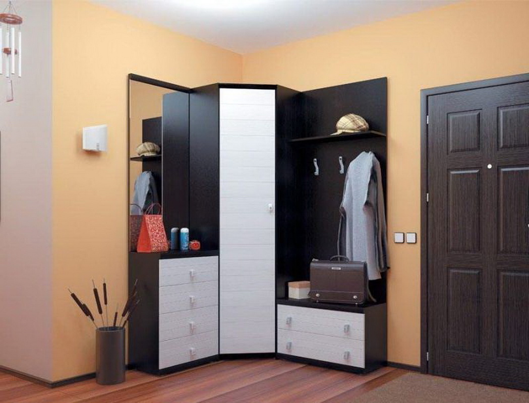 Одной из идей оформления угловой прихожей является установка радиусной мебели, которая имеет много функции и занимает мало места. Прекрасно подходит для помещений различной площади.