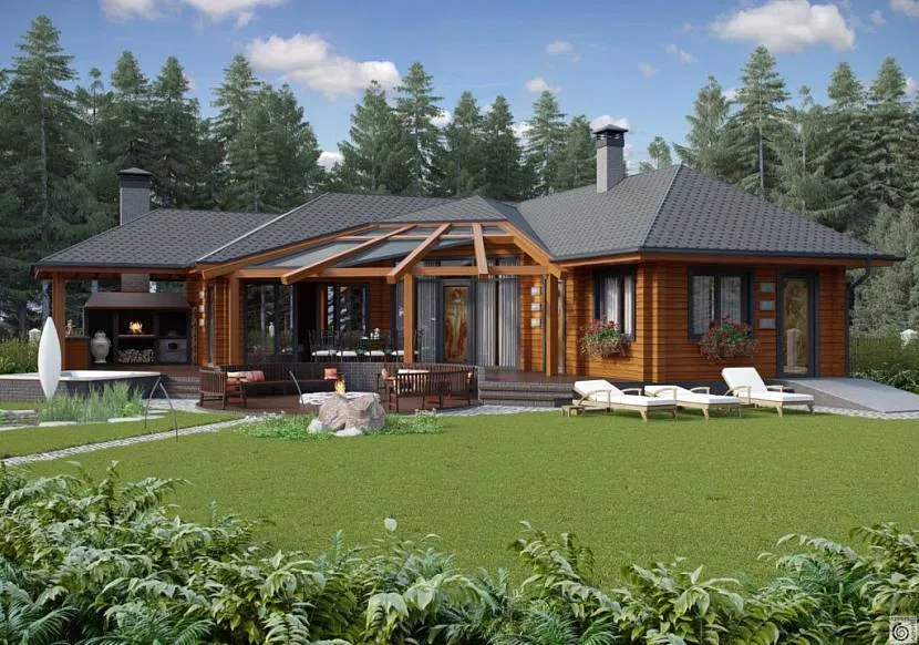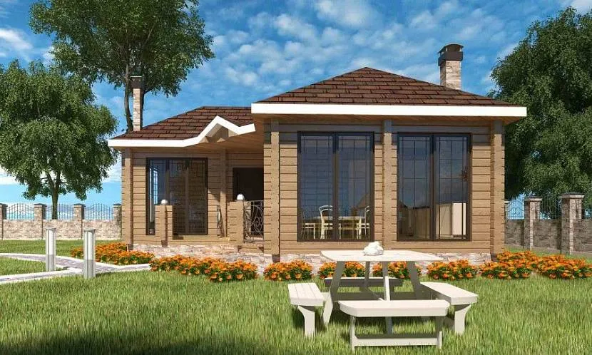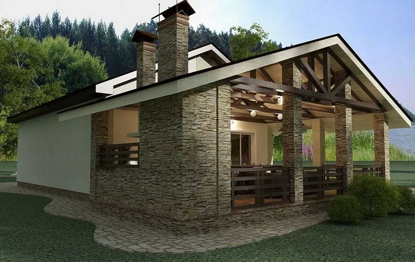 Одноэтажная баня из пеноблоков с большой террасой и барбекю