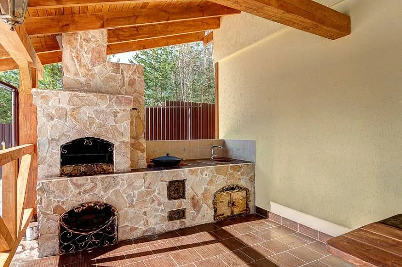 Рядом с печью для барбекю пол лучше выложить кафельной плиткой. Ее легко мыть и при этом она хорошо переносит попадание искр, поэтому точно не загорится.