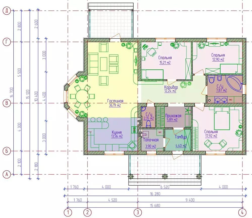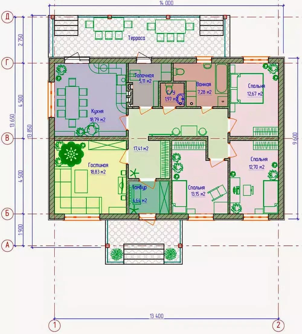 - Отсутствие в проекте лестниц и проходов коммуникаций на более высокие этажи. Благодаря этому, планировка постройки в один этаж позволяет эффективно воспользоваться имеющимся пространством;