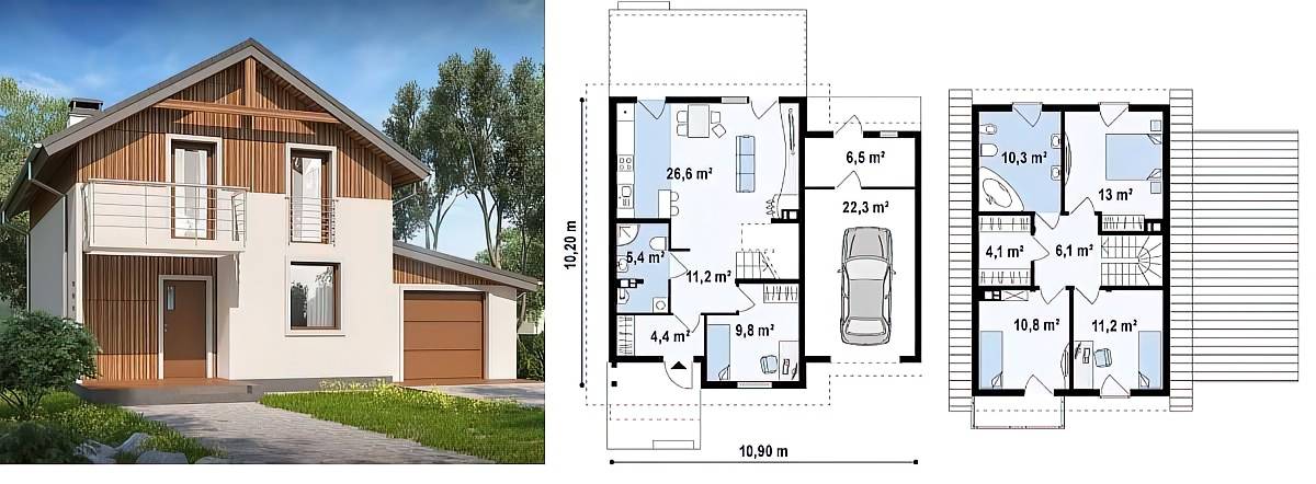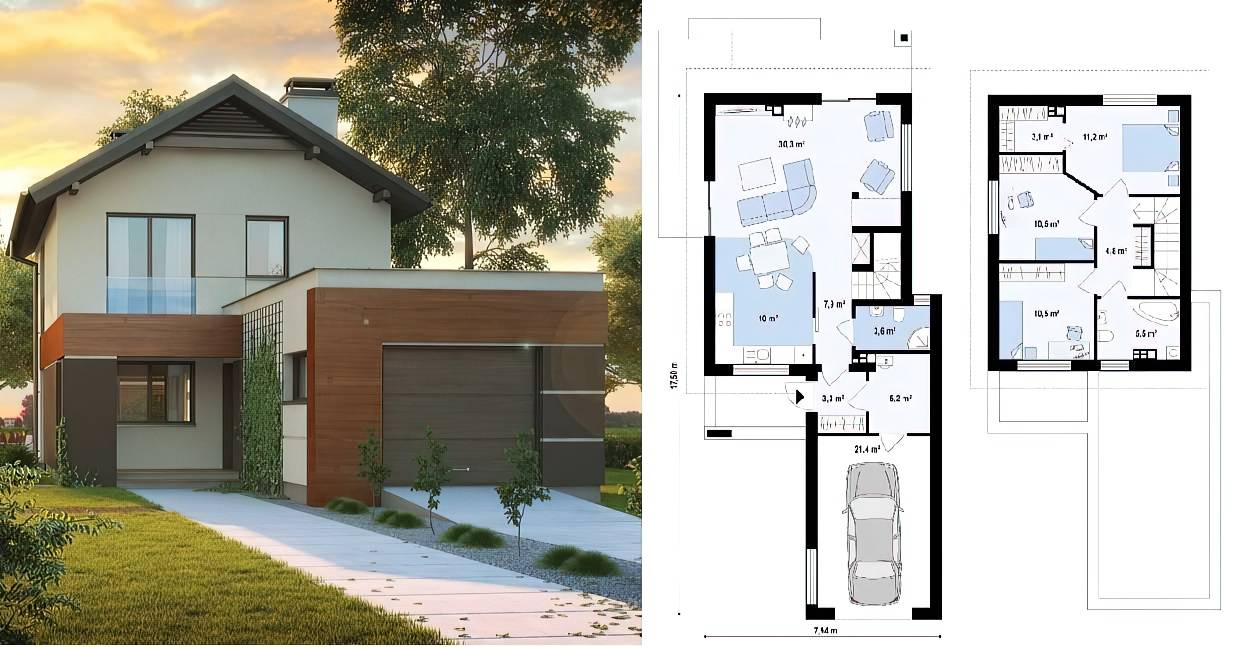Проект небольшого двухэтажного дома для дачи с пристроенным гаражом: жилая площадь 100 м², общая 127 м², гараж на одну машину