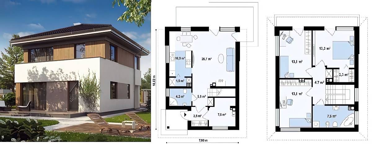 В данном варианте планировки с тыльной стороны дома предполагается просторная терраса. В общую площадь дома она не входит. Интересный дизайн делает дом непохожим на другие: большое окно на полтора этажа, кубической формы гараж и навес перед домом — не слишком влияют на ценник, но делают дом уникальным.