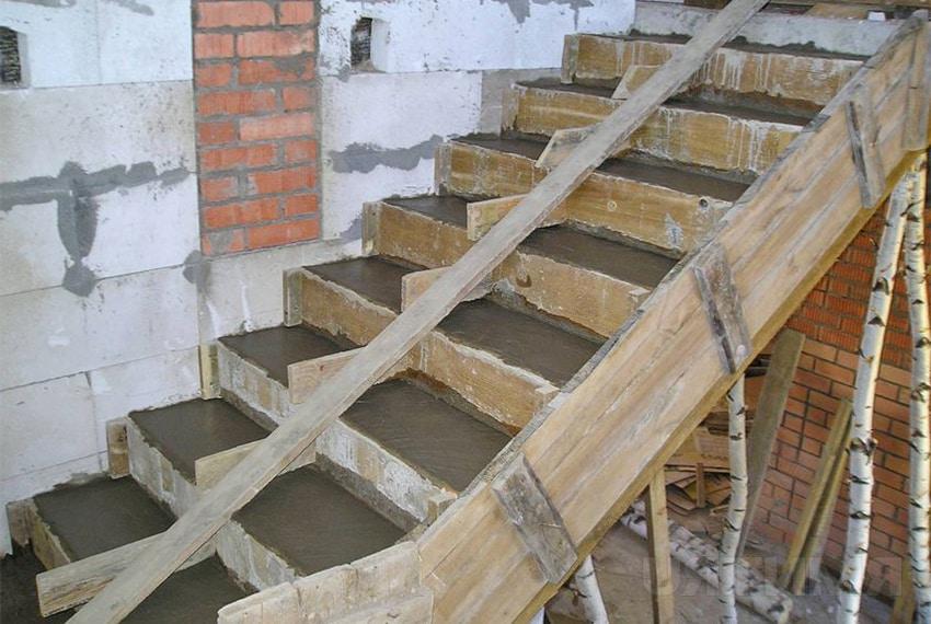 - Конструкцию армируют и к стенам или боковым стенкам опалубки крепят подступенки.