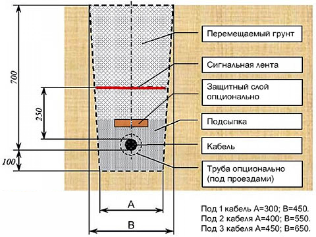 Что касается глубины, то кабельные линии до 20 кВ должны быть заложены на глубину 0,7 м, до 35 кВ — 1 м, при с улицами и площадями — 1м вне зависимости от напряжения, кабельные линии с маслонаполнением должны быть заложены на глубину 1,5м.